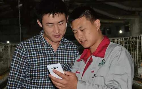 兩名養(yǎng)殖戶正在手機上操作新希望集團推出應(yīng)用軟件(受訪者供圖)
