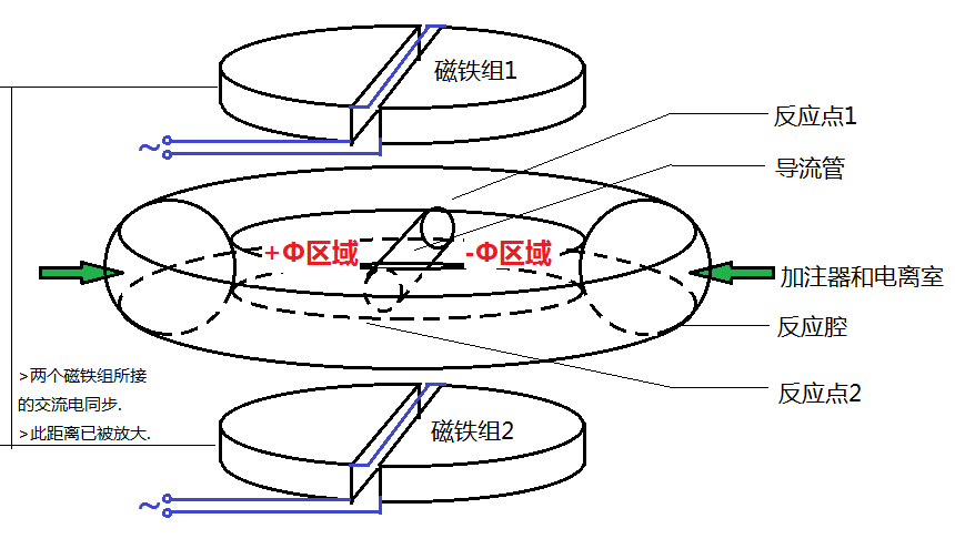 如圖, 兩組電磁鐵平行放置, 反應腔夾于磁鐵之間. 每個電磁鐵組水平均分為兩半, 中間以狹縫隔開. 其線圈繞組使得在通交流電時兩半的磁場方向相反, 大小相同. 兩組電磁鐵通以同步高頻交流電, 于是就可以使兩組電磁鐵之間的半邊磁通量變化, 從而在反應腔所在的位置產生渦旋電場. 兩邊的渦旋電場在反應腔中部橫穿的導流管處疊加. 導流管兩端自然產生主、副對撞點, 即反應點1和2. 反應腔內同時還存在水平方向同軸的環(huán)形磁場(此點與托卡馬克相同), 用于約束粒子沿環(huán)形軌跡運動, 并在反應點處收緊以壓縮等離子體.