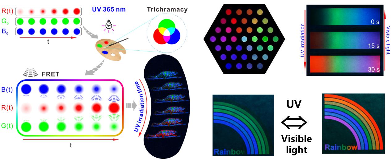 比如發(fā)光的防偽材料,利用纖維素均相可控反應(yīng)的優(yōu)勢,把原來容易聚在一起的熒光分子,通過化學(xué)方法鍵合到纖維素上,克服了溶液狀態(tài)下聚集誘導(dǎo)淬滅效應(yīng),將其制成固態(tài)熒光材料,同時它仍然具有高分子的可打印、可噴涂的特點(diǎn),將不同的發(fā)光基團(tuán)接到不同的纖維素上可以得到不同的顏色,將紅、綠和藍(lán)三種顏色的纖維素衍生物共混,利用三基色原理,還可以做打印的動態(tài)熒光材料(圖5)。