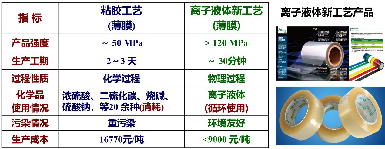 以前纖維素制膜工藝污染很大,中國逐漸在關(guān)停。而我們的離子液體工藝是物理溶解,基本沒有污染。原來工藝需要三天時間,現(xiàn)在三十分鐘就做出來了(圖8)。在車間里面都聞不到氣味,火都點(diǎn)不著,非常安全。其中溶劑是我們的專利,包括后面的溶劑回收,溶劑是可以回收再反復(fù)利用的。用我們這個工藝與企業(yè)合作建立了生產(chǎn)線,2019年基本已經(jīng)建成了,今年11月底試車。生產(chǎn)的產(chǎn)品推薦在快遞物流上使用,特別是用低成本秸稈做的膠帶,有很好的應(yīng)用前景。