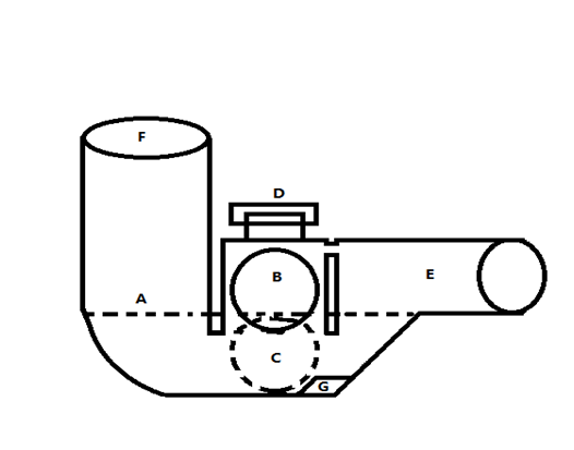 排水管的設(shè)計(jì)(如圖):本設(shè)計(jì)是在U型管道的基礎(chǔ)上增加固體阻斷機(jī)構(gòu)(球形、圓柱形等多種形體),當(dāng)U型管道中填充一定量的水時(shí),機(jī)構(gòu)內(nèi)的阻斷球就會(huì)在浮力的作用下,處于完全開(kāi)放的狀態(tài),當(dāng)U型管道內(nèi)的水因得不到及時(shí)補(bǔ)充而氣化,這時(shí),B球體在重力作用下,隨著管內(nèi)水位下降而下落。在管道底部、球體下落方向增設(shè)斜面,增加球體下落壓力,增加球體密封效果。當(dāng)管道內(nèi)補(bǔ)充一定的水量時(shí),球體的水的浮力作用下,上浮到B區(qū),保持管道通暢。從而達(dá)到有效阻止有害物質(zhì)回流的目的。