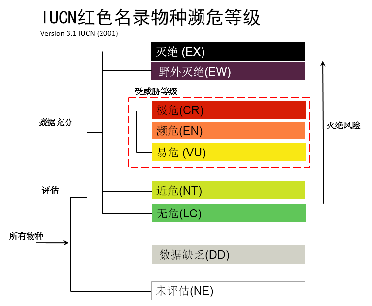 IUCN自20世紀(jì)60年代成立之日起,就設(shè)立了物種生存委員會(huì)(SSC),開(kāi)始編制和印刷《IUCN瀕危物種紅皮書(shū)》,后來(lái)隨著評(píng)估物種的增加,印刷版逐步發(fā)展為網(wǎng)絡(luò)版的《IUCN瀕危物種紅色名錄》,定期編制發(fā)布。IUCN/SSC研究制定了《IUCN物種紅色名錄瀕危等級(jí)和標(biāo)準(zhǔn)》,根據(jù)物種的種群數(shù)量和分布情況等,評(píng)估其生存狀況,確定其瀕危等級(jí)。IUCN瀕危物種等級(jí)標(biāo)準(zhǔn)分為“有評(píng)估數(shù)據(jù)”和“數(shù)據(jù)缺乏”兩類(lèi),“有數(shù)據(jù)評(píng)估”中又分為“滅絕”、“野外滅絕”、“區(qū)域滅絕”、“極危”、“瀕?!?、“易?!薄ⅰ敖!焙汀盁o(wú)危”等8個(gè)級(jí)別,從“無(wú)?!钡健皹O?!保瑴缃^風(fēng)險(xiǎn)逐步上升,瀕危等級(jí)逐步增加。瀕危等級(jí)標(biāo)準(zhǔn)有5個(gè)指標(biāo),分別是種群下降、有限地理分布區(qū)、下降小種群、非常小或非常有限的種群、以及模型模擬等量化分析,根據(jù)這些指標(biāo)的數(shù)量閾值,來(lái)評(píng)估物種的瀕危等級(jí)。
