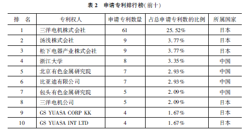 從不同年份上來(lái)看,中國(guó)專利不斷增加,原來(lái)口本比中國(guó)多,后來(lái)中國(guó)慢慢增多。但實(shí)用的還是不多,仍然還是一個(gè)問(wèn)題,還得有進(jìn)一步的提高。另外,從申請(qǐng)單位來(lái)看,排在前十名的都是中國(guó)和口本的一些單位(表2)。比如說(shuō)三洋電機(jī)株式會(huì)社、湯淺株式會(huì)社、松下電器產(chǎn)業(yè)株式會(huì)社、浙江大學(xué)、北京有色金屬研究院、比亞迪等。