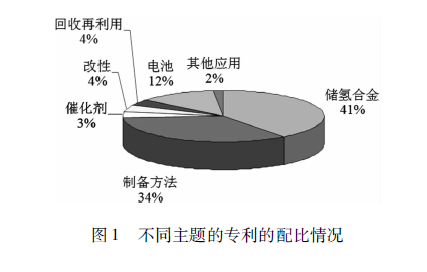 這里面是不同的研究主題分布,還是以儲(chǔ)氫合金的開(kāi)發(fā)居多一點(diǎn),然后還有催化劑、改性等(圖1)。我覺(jué)得在這里面可能有三個(gè)領(lǐng)域在技術(shù)上發(fā)展比較突出一點(diǎn)。第一個(gè)就是成分的改變,通過(guò)改變儲(chǔ)氫合金成分開(kāi)發(fā)新的合金提高了鎳氫電池容量,是一個(gè)很重要的進(jìn)步。傳統(tǒng)是ABS型的,后來(lái)跟ABS型的和AB2型的結(jié)合到一起,就變成了A2B7型的,這就是口本三洋公司開(kāi)發(fā)出來(lái)的。這個(gè)儲(chǔ)氫合金成為了目前研究的主流,容量比傳統(tǒng)的要大很多,成分上的突破是一個(gè)很大的進(jìn)步。第二個(gè)是甩帶快淬技術(shù)在儲(chǔ)氫合金粉體制備上的應(yīng)用,原來(lái)這種技術(shù)最早是用來(lái)制備非晶態(tài)合金的,后來(lái)用到了永磁粉體的制備,現(xiàn)在又開(kāi)始進(jìn)人到了鎳氫電池上面來(lái)了,對(duì)于鎳氫電池容量和穩(wěn)定性的提高都有非常大的幫助。第三個(gè)重要的突破的是儲(chǔ)氫合金表面改性,表面有一層鎳,可以進(jìn)一步提高電導(dǎo)率,增加電流。這三方面是在技術(shù)上有了比較大的提高和發(fā)展。