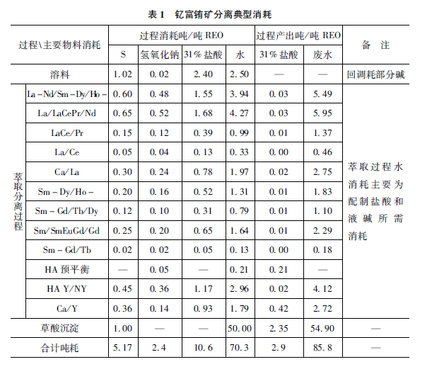 從目前的稀土分離基本工業(yè)流程,不難注意到,各段工藝間相對(duì)獨(dú)立,過(guò)程中消耗酸堿等化工原料和水,最終處理后作為廢水排放。以中憶富鋪稀土原料分離為例,典型試劑消耗如表1,每分離提純1噸稀土氧化物,消耗10噸左右的鹽酸、2. 4噸燒堿等化工材料,產(chǎn)生85噸廢水,其中含鹽量6. 8噸。