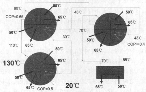 比如說結(jié)構(gòu)是這樣的,這兒是一個電廠,這是我剛才說的上千公里的管道,因為是密密麻麻的蜘蛛網(wǎng),各個尾巴上都是換熱站?,F(xiàn)在的一個重要革新是使換熱器的一側(cè)溫度從原來的130℃-70℃變?yōu)?30℃-20℃,而另一側(cè)溫度不變,仍然是40℃進人,55℃流出。這就進一步增大了管網(wǎng)的輸送能力,或者說減少了循環(huán)水泵電耗。怎么能實現(xiàn)這樣的參數(shù),使得反向傳熱呢? 具體的流程見這張圖(見圖2)。這個就不是[火積]的事了,而是以溫差為動力,是[火用],將其轉(zhuǎn)化為功,再用功去制冷。實際上就是一個吸收式制冷機,用130℃的三角去做功,去進一步加大溫差,就能把這根線給降下來了。怎么實現(xiàn)呢? 見圖中流程。用130℃的水驅(qū)動吸收式制冷機制冷,以冷卻自己的回水。這樣,整個機組從外面看等效是一個換熱器,也不需要任何外界的電力輸人。換熱器兩側(cè)水流量的比例是1:7.3,流量特別不匹配,但是也沒有用別的動力,就是靠溫差就把這個問題解決了。這是個實際的設(shè)備和系統(tǒng),機器已經(jīng)在實際系統(tǒng)中運行了好幾年了。