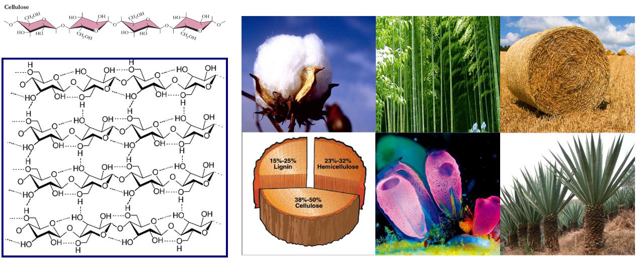圖1 纖維素分子結(jié)構(gòu)、聚集態(tài)結(jié)構(gòu)與來(lái)源