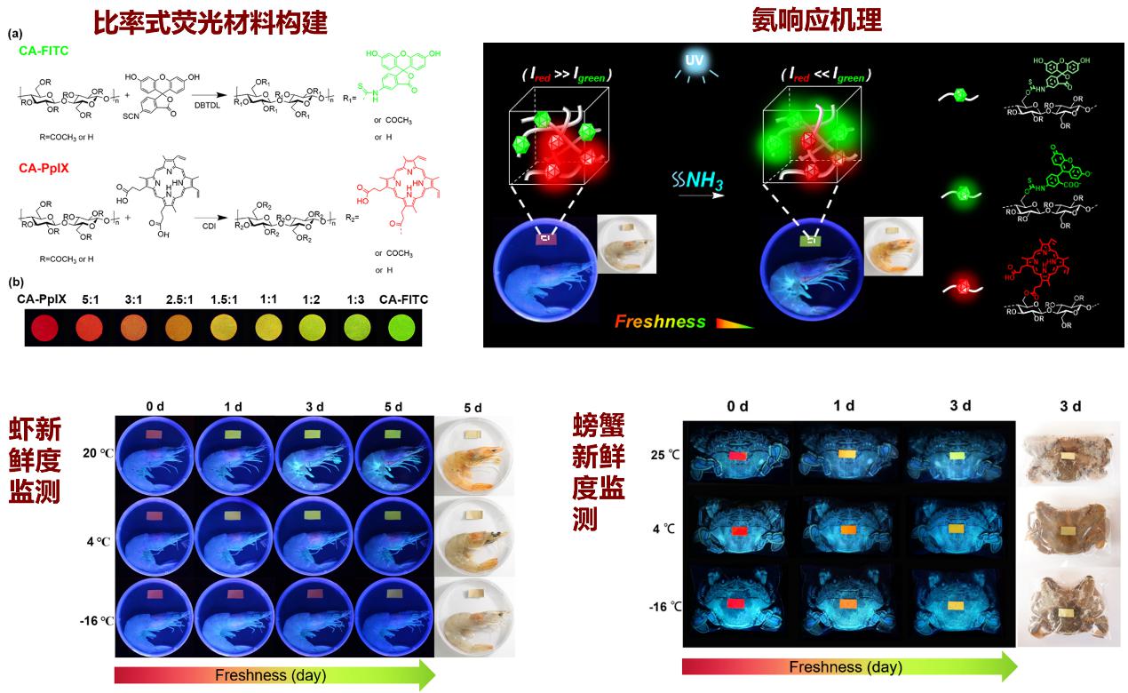 圖6 纖維素基胺響應(yīng)雙發(fā)射固態(tài)熒光標(biāo)簽:海鮮新鮮度監(jiān)測(cè)